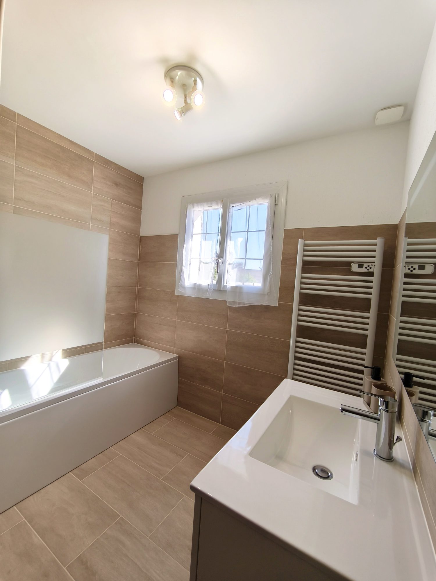 Au rez-de-chaussée : une entrée avec placard, une pièce de vie, une cuisine semi ouverte équipée et aménagée, un dégagement desservant 2 chambres avec placard, une salle de bain avec placard et un wc indépendant.