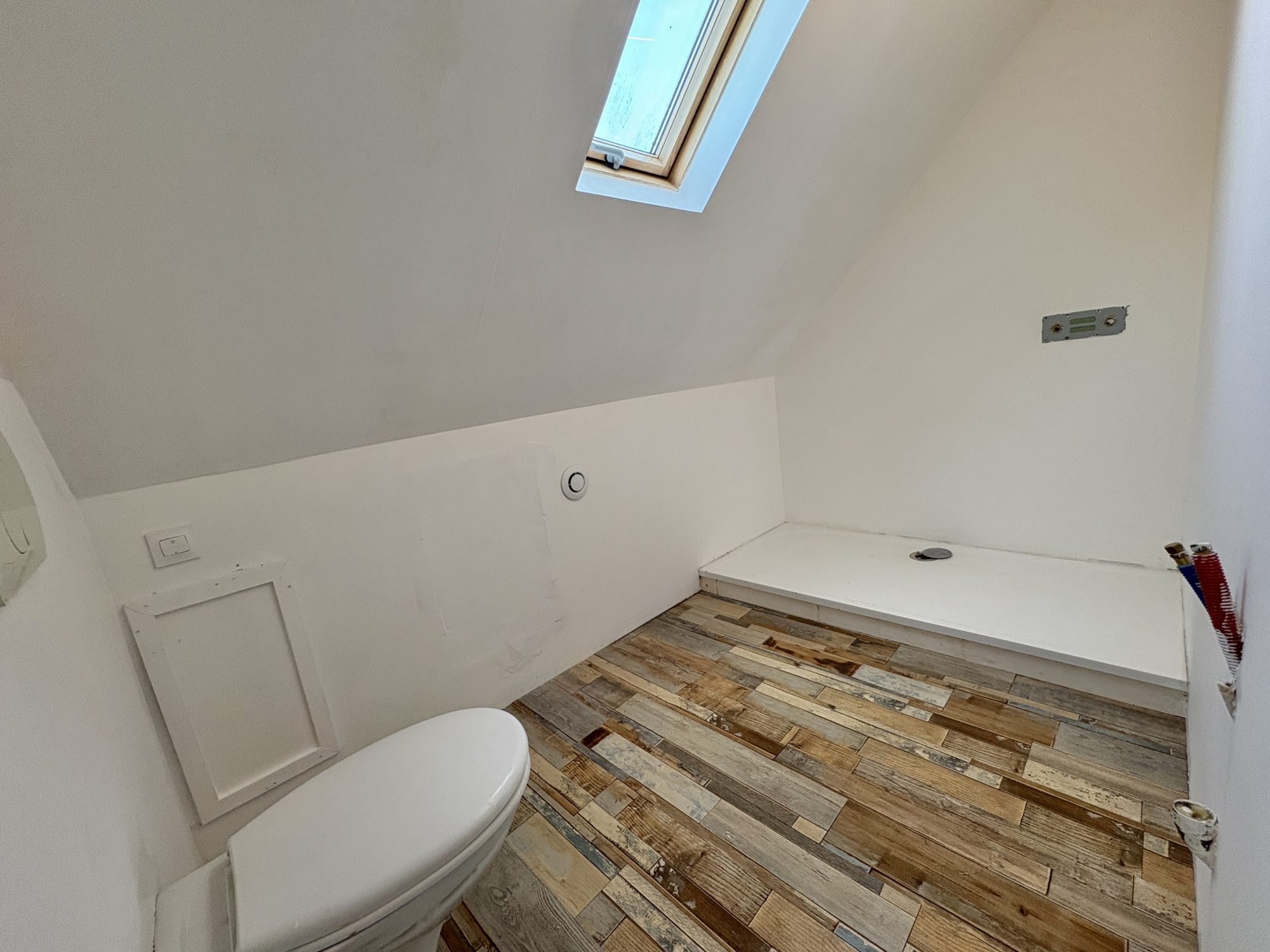 A l’étage : un palier desservant trois chambres, une salle d’eau avec wc à finir d’aménager.