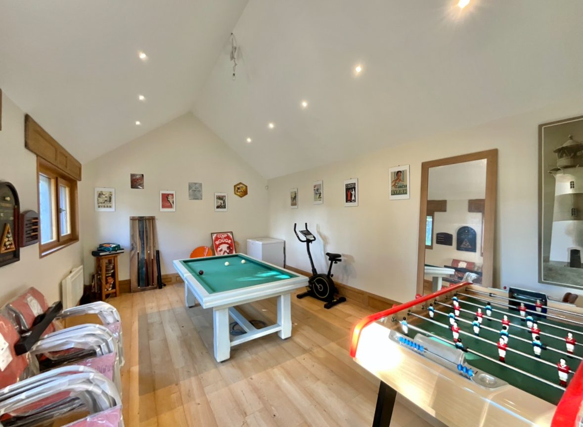 Dépendances : un double garage avec grenier aménageable, une verrière avec une pièce isolée (salle billard), un atelier pour stockage. Cave.