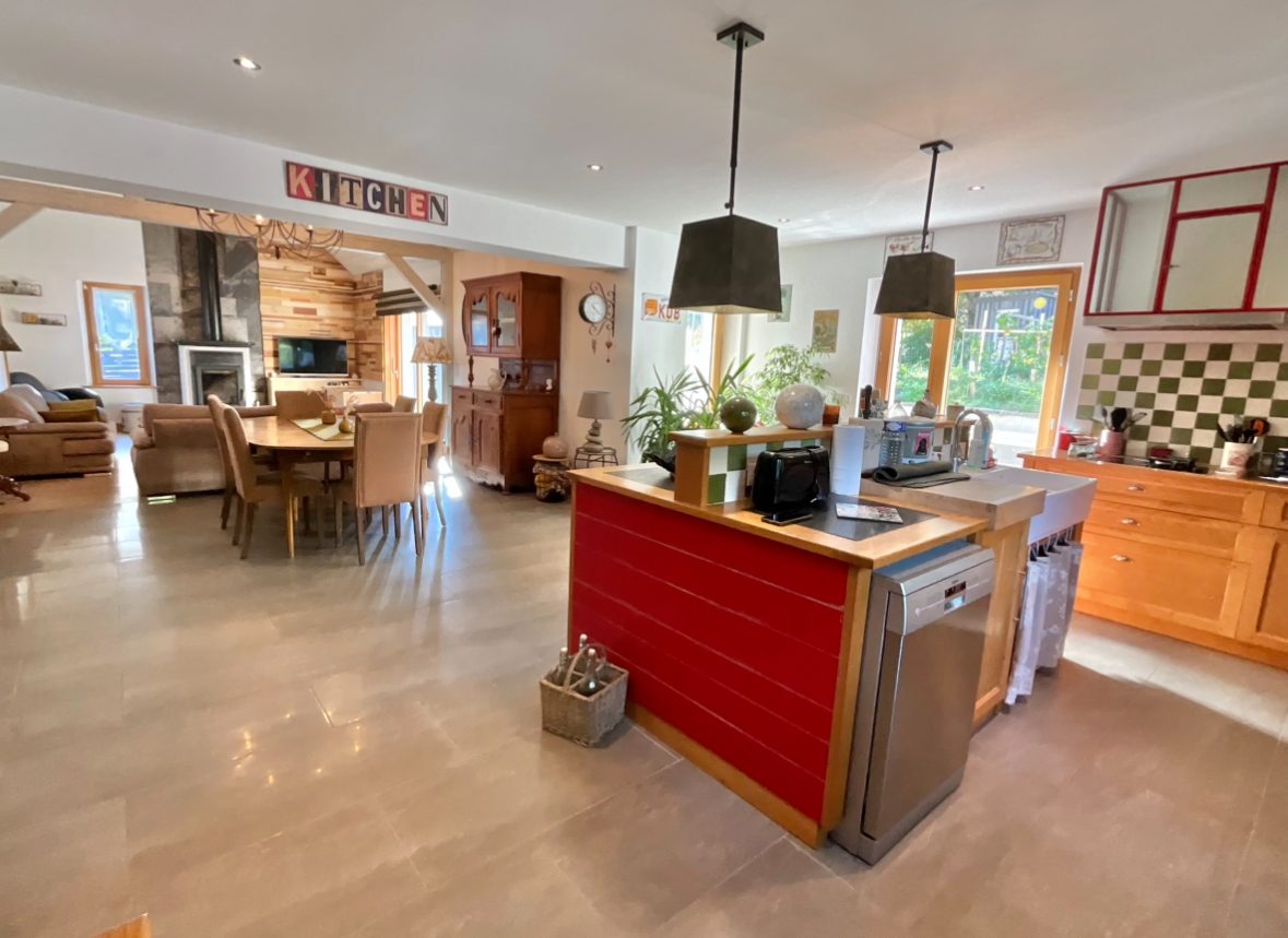 Une cuisine américaine donnant sur une spacieuse et lumineuse pièce de vie avec un grand salon et son poêle à bois.