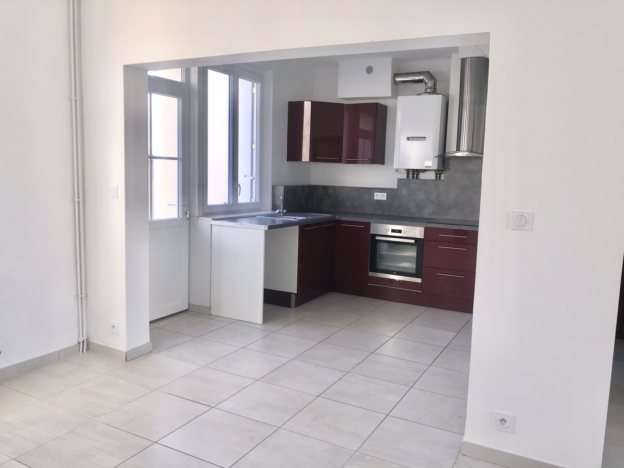 Proche centre-ville et du château, agréable maison composée de 3 pièces principales, d’une superficie de 64 m2 environ et comprenant au rdc : une entrée, un wc, un salon/salle à manger avec cuisine ouverte aménagée et équipée (four, plaque de cuisson et hotte).