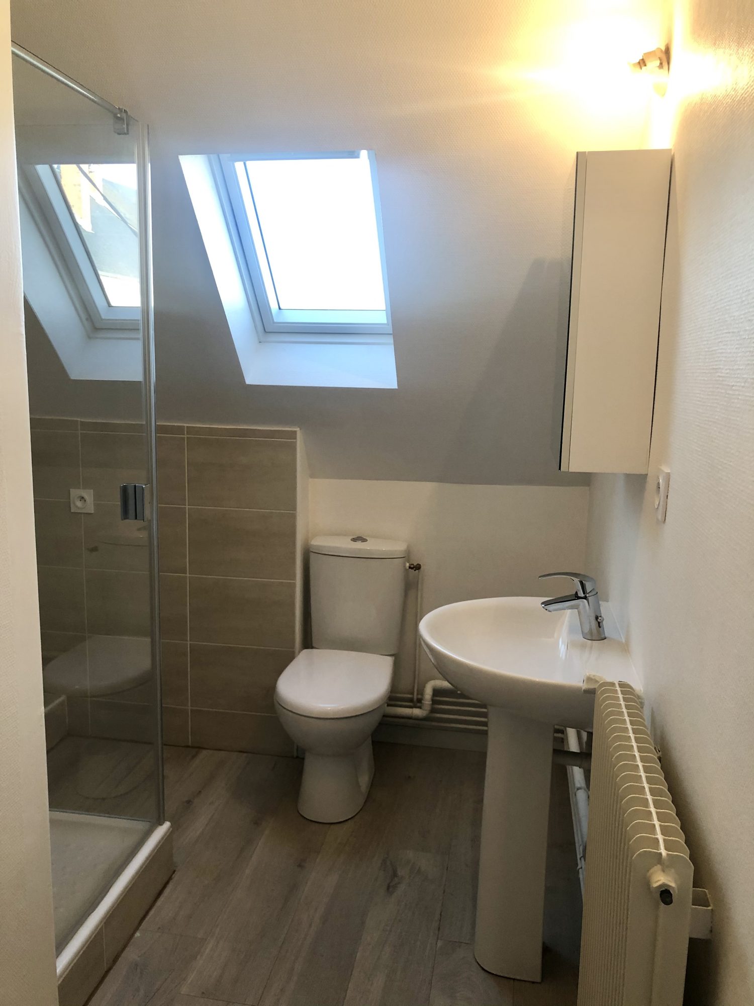A l’étage : petit palier, 2 chambres et une salle de douche avec wc.