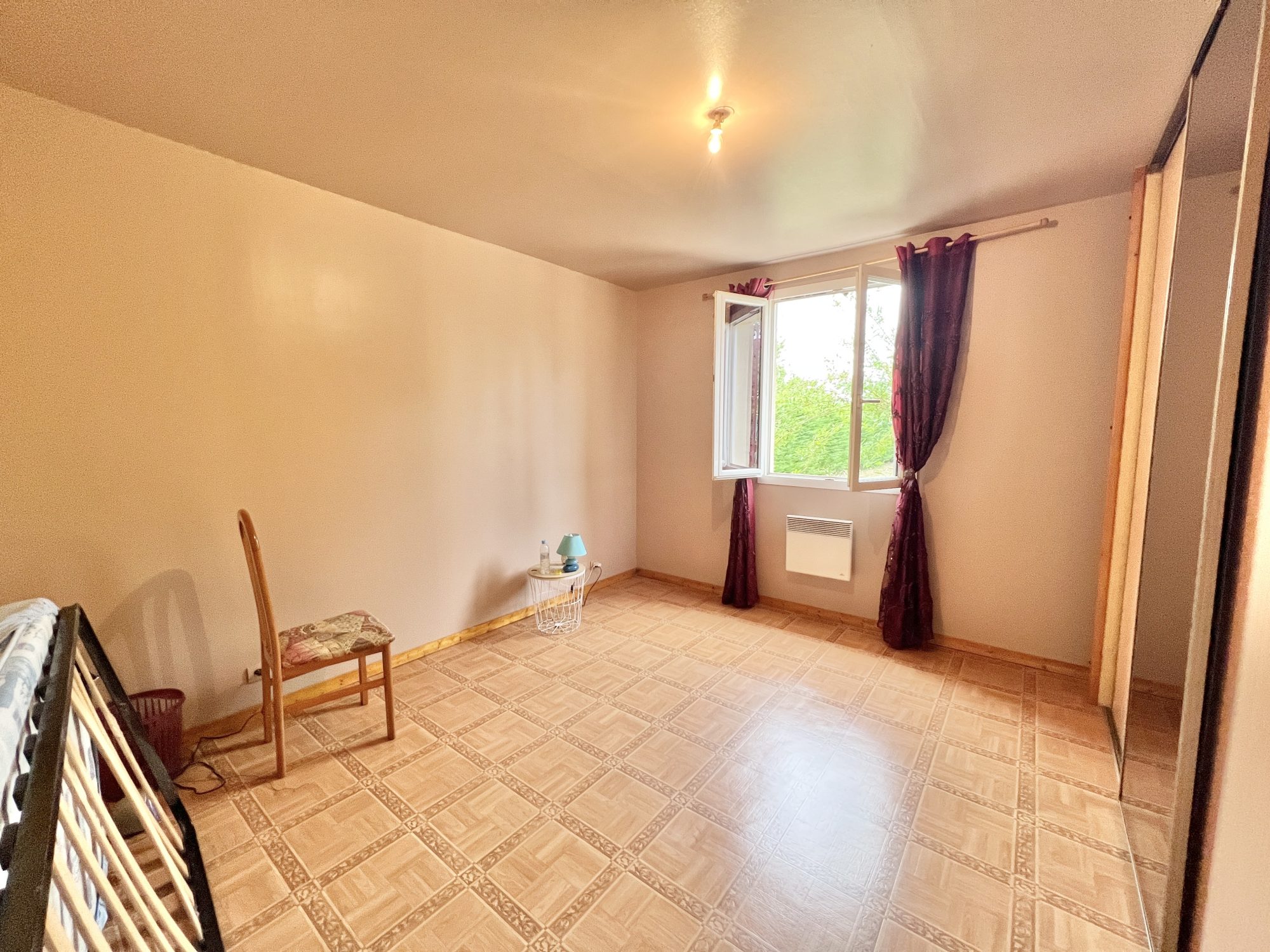 Une vaste et lumineuse pièce de vie avec poêle à bois, une cuisine aménagée et équipée, un couloir desservant 3 chambres, un wc séparé et une salle de bains avec douche.