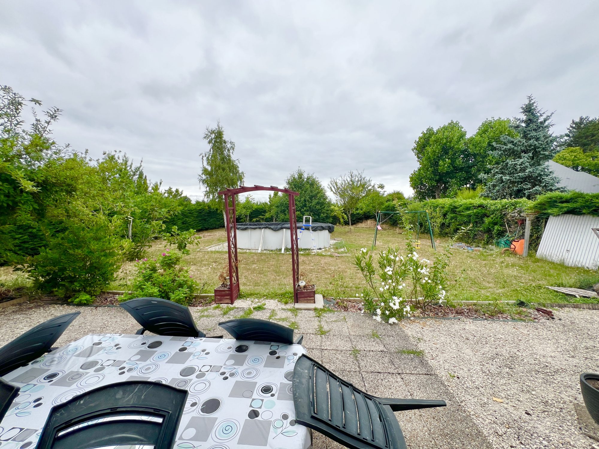 Terrain clos et arboré de 1 211 m2 avec piscine hors-sol et cabanon de jardin.