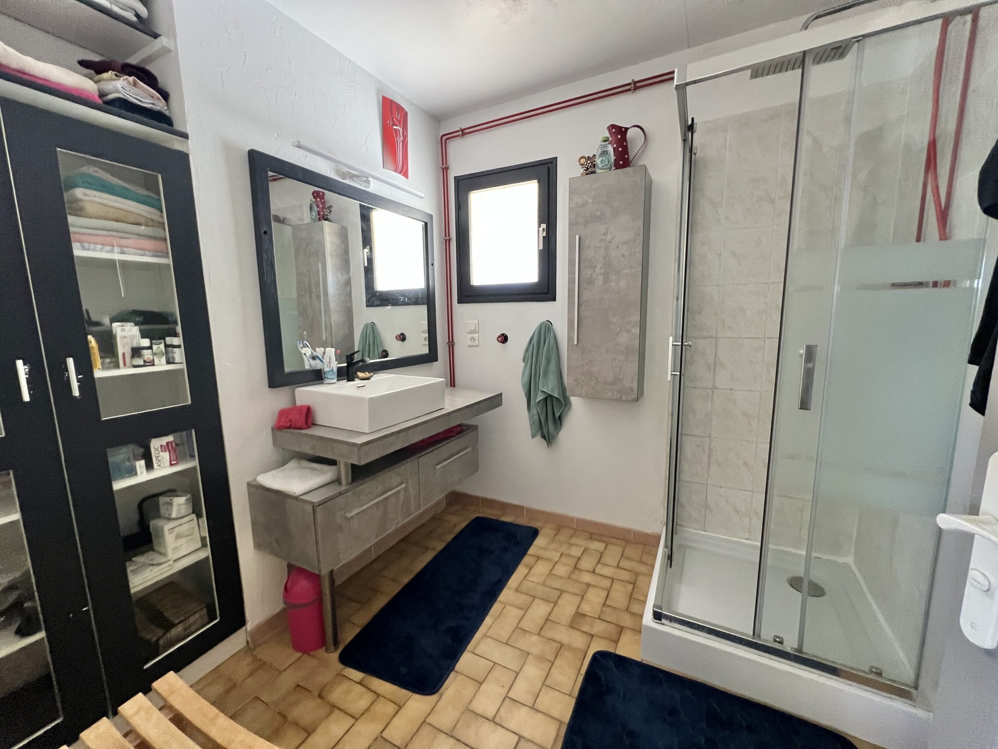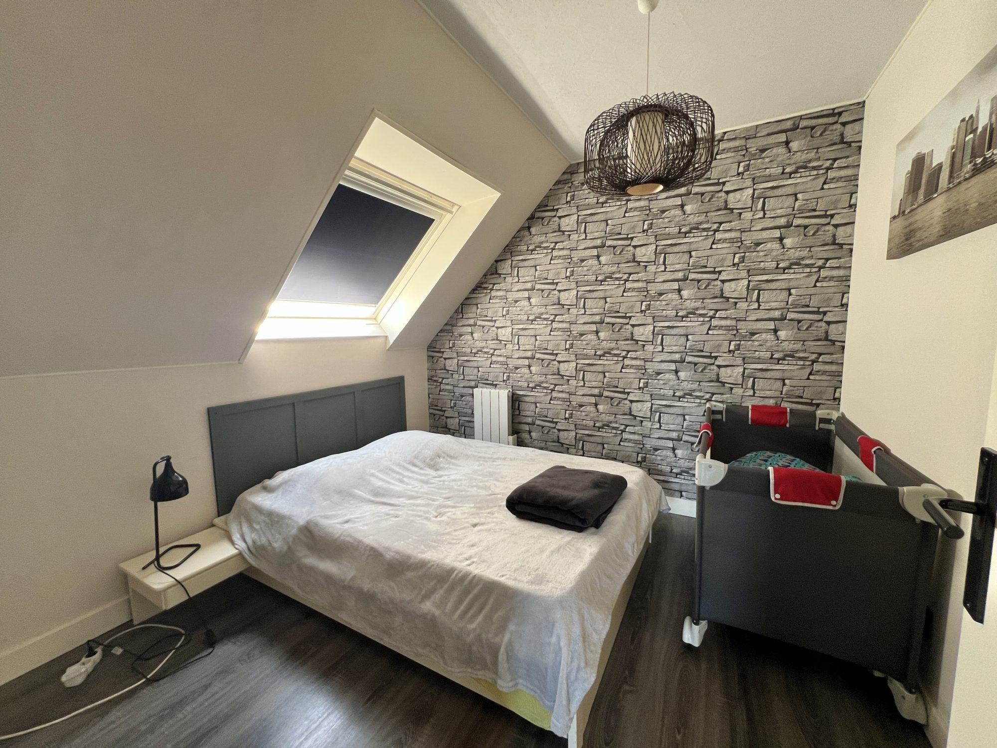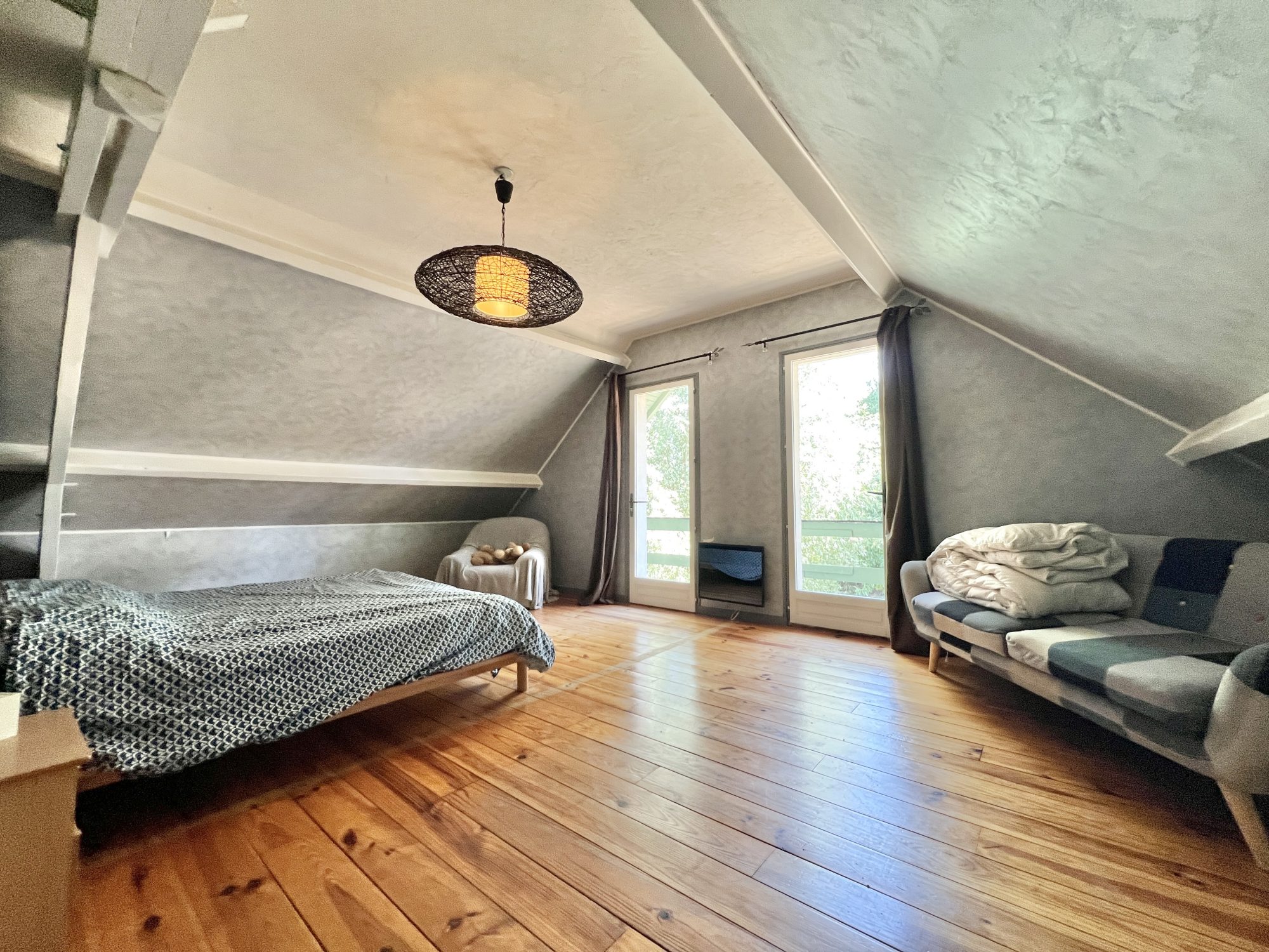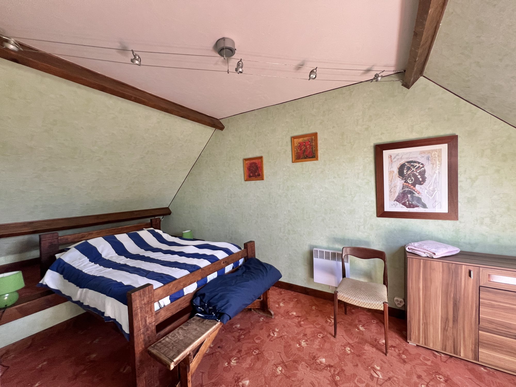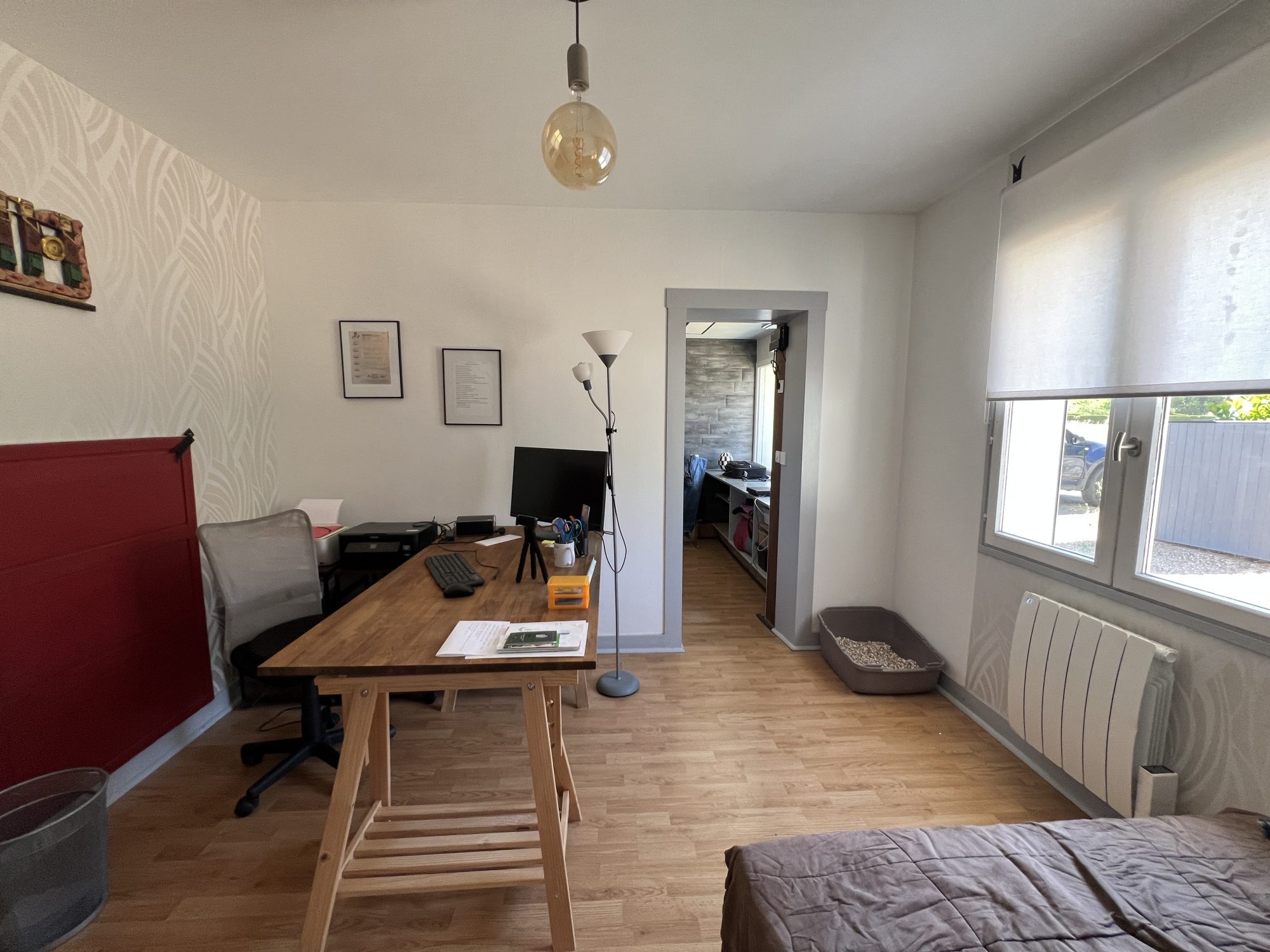 A l’étage : un palier desservant trois chambres, une salle de bains avec douche et wc, un espace bureau.