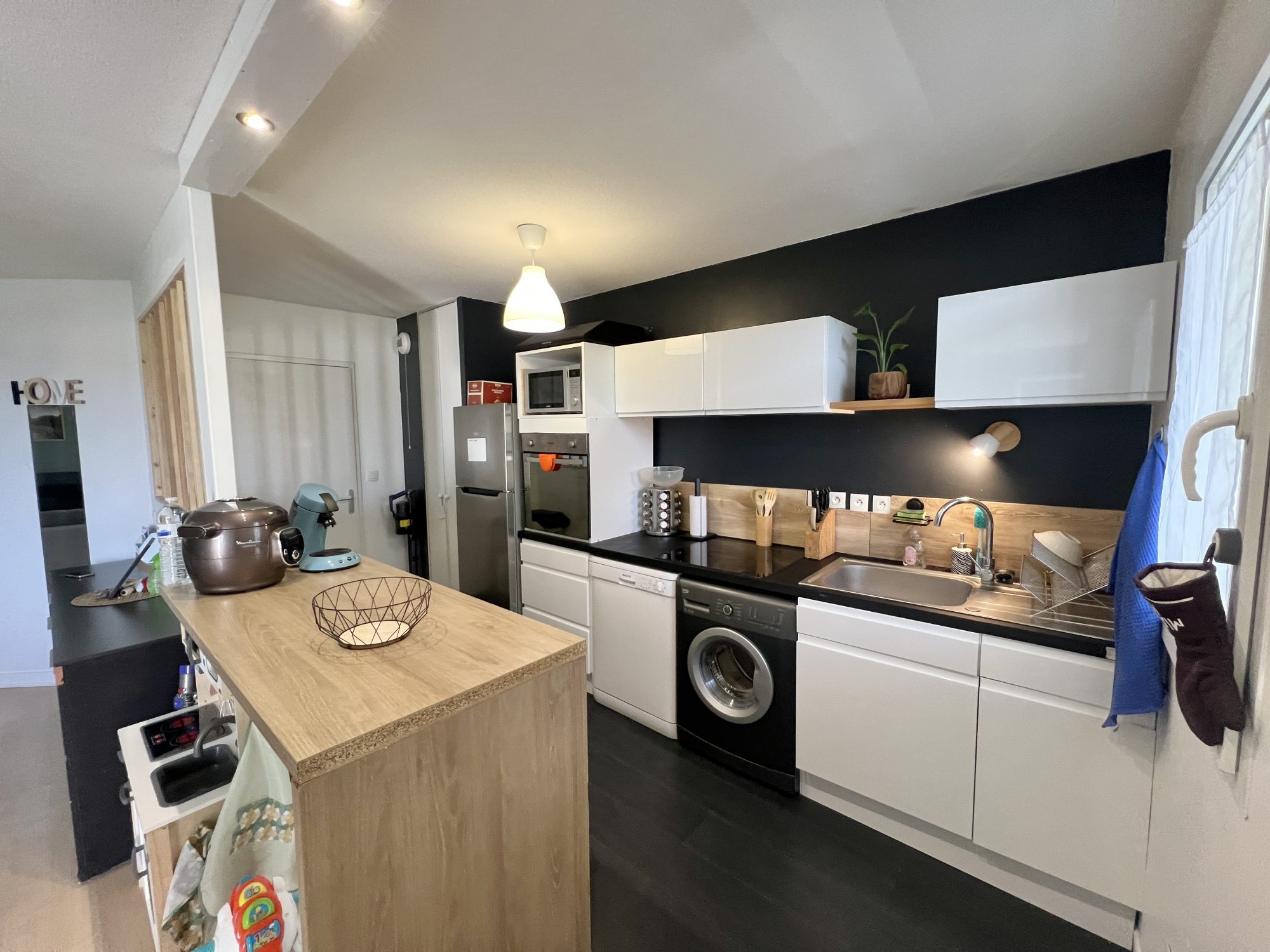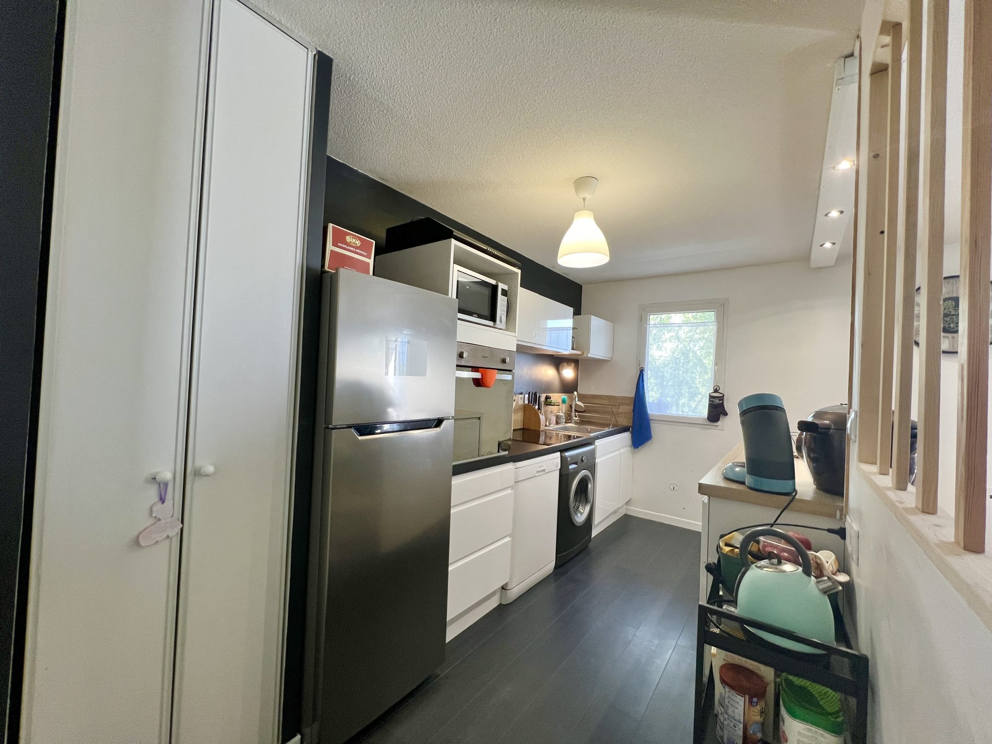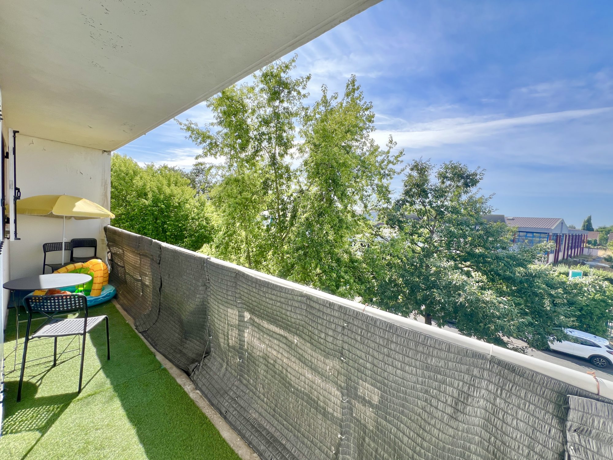 – une entrée avec placard, un wc indépendant, une vaste pièce de vie lumineuse avec cuisine aménagée donnant sur un balcon avec une vue dégagée sur de la verdure.
